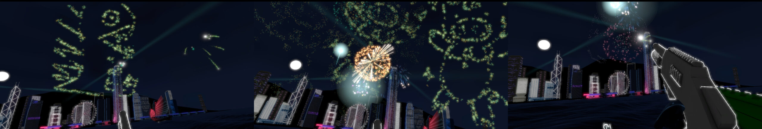 “Wear the VR goggle, and witness your own drawings glamourously transform into DIY fireworks. Experience the extravaganza, solely personally yours, from different perspectives as if they exist in reality.”